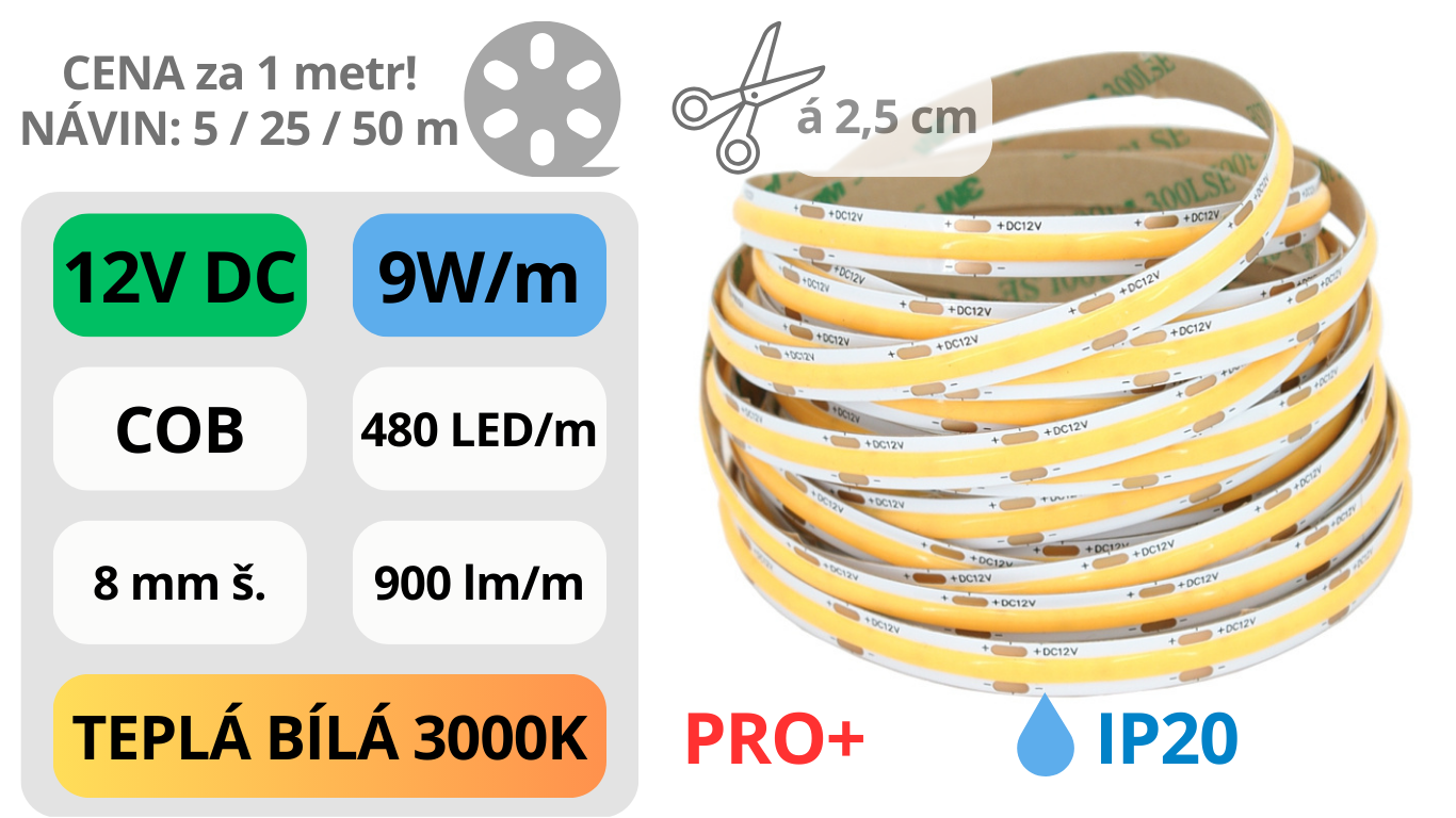 LED pásek COB 12V / 480LED / 9W / 3000K / IP20 / 8mm / PRO+595 Kč/ ks492 Kč bez DPH