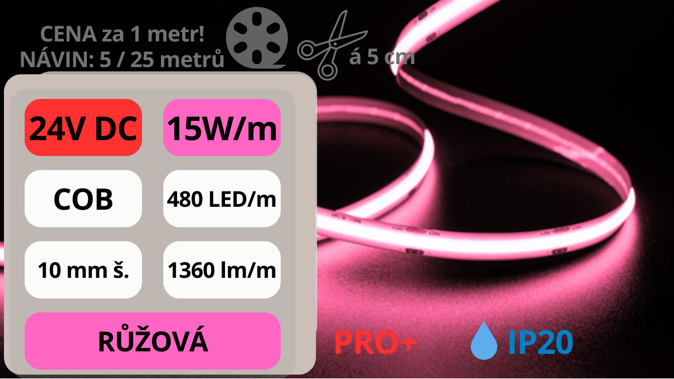 LED pásek COB 24V / 480LED / 15W / RŮŽOVÁ / IP20 / 10mm / PRO+1 345 Kč/ bm1 112 Kč bez DPH