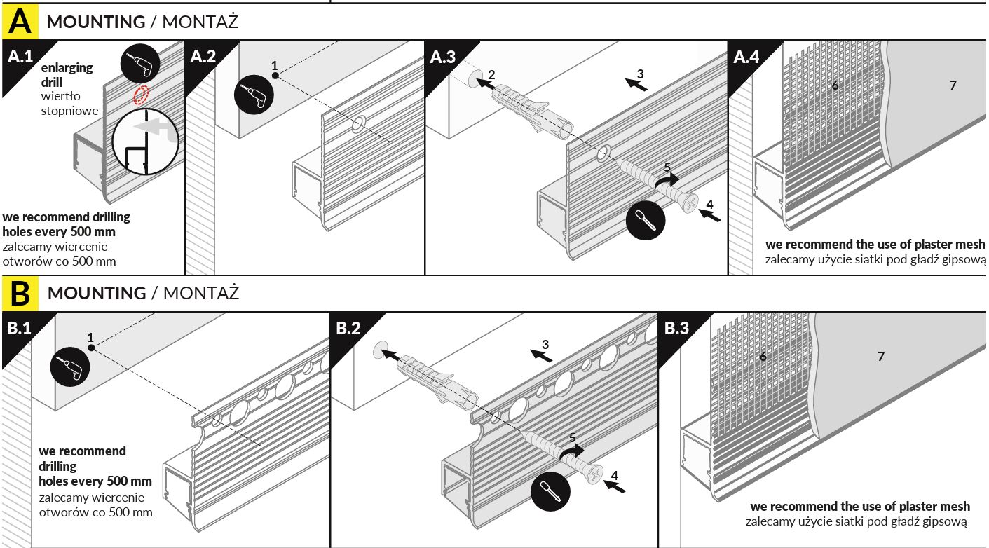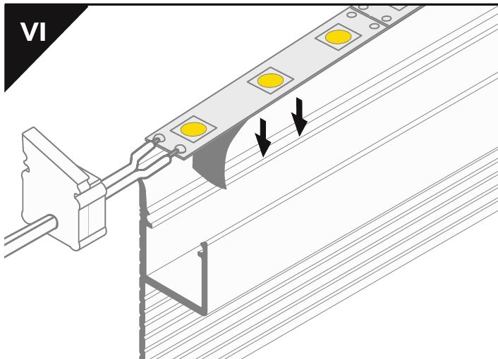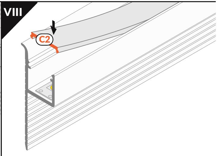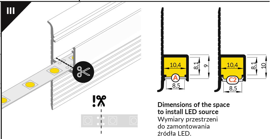 Konstrukce LED profilu umožňuje montáž profilu do SDK desky o minimální tloušťce 12.5mm a následné finální přetmelení části profilu.