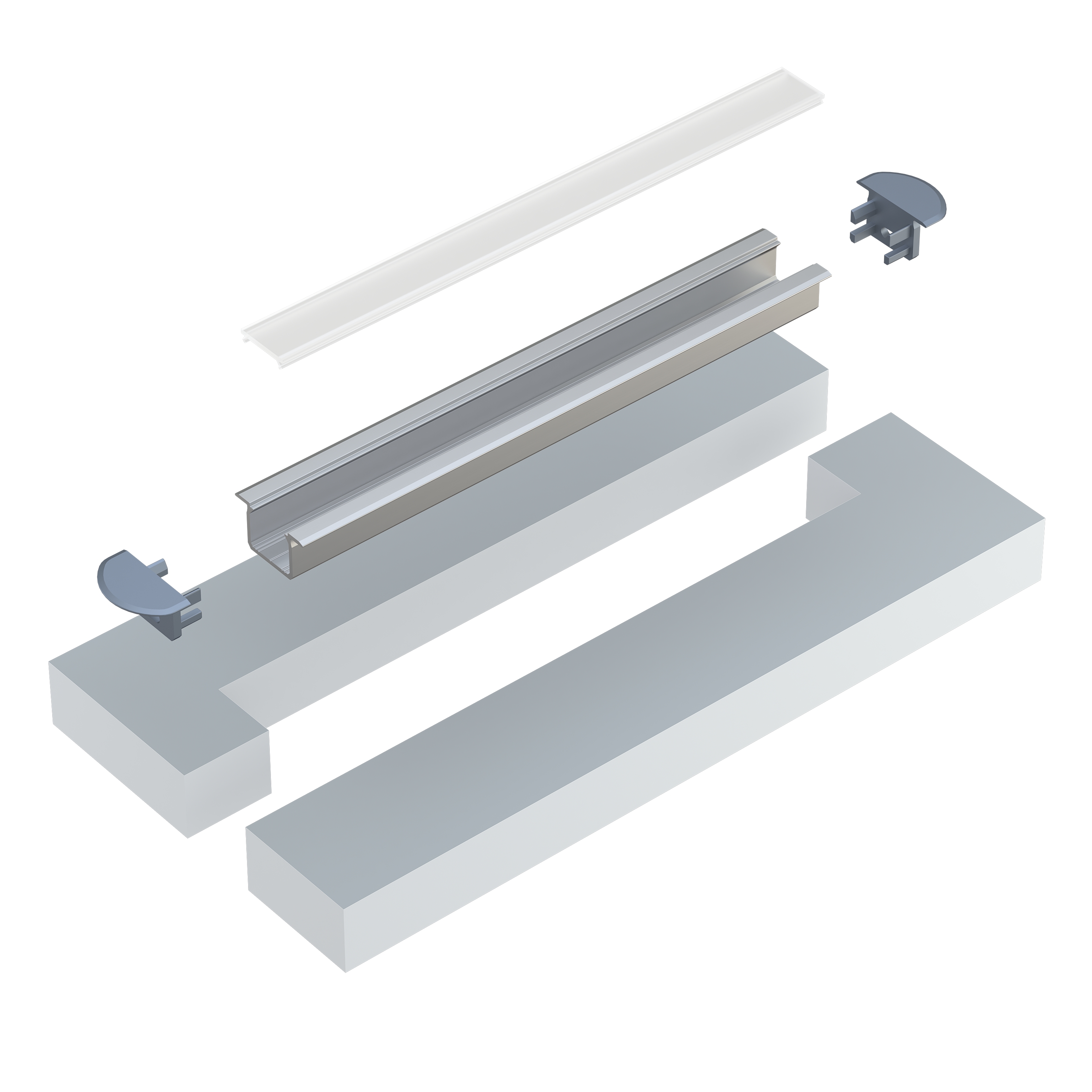 Schéma montáže profilu U do 12mm hluboké drážky v nábytkové nebo SDK desce, s difuzorem BASIC a s PVC koncovými záslepkami.