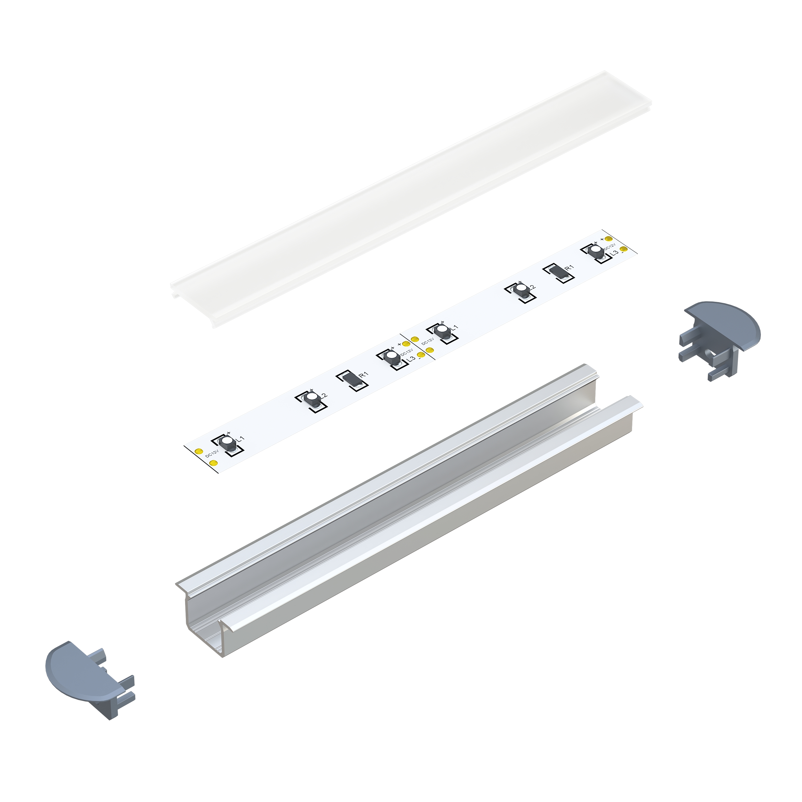 Schéma montáže prvků osvětlovací soustavy s použitím profilu U a příslušenstvím - difuzor BASIC, LED pásek, PVC koncové záslepky