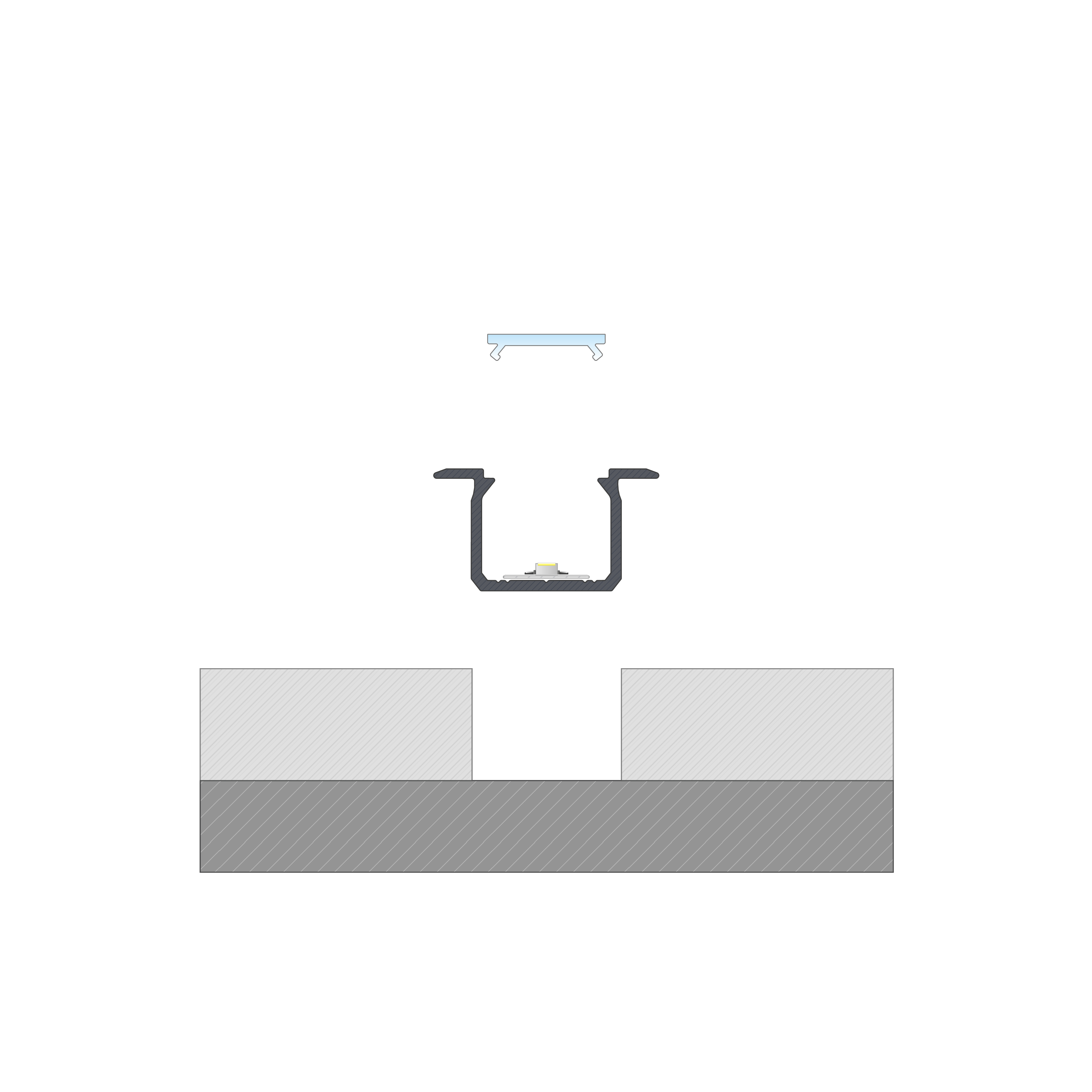 Schéma montáže + finální efekt montáže zapuštěného LED profilu U s difuzorem BASIC: