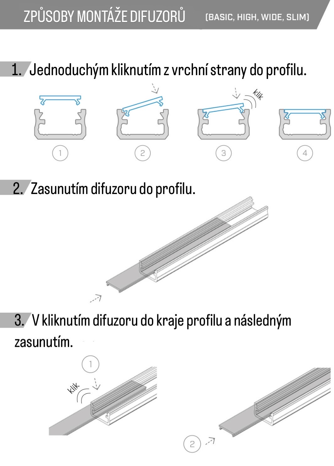 Montáž difuzorů se provádí jednoduchým zakliknutím difuzoru z vrchní strany profilu.